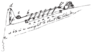 9. I have employed much thought & have made several drawings with a view to the contrivance of a means of opening & shutting a set of blinds over each window, without going for that purpose upon the roof.—If the roof were cylindrical so as to put all the blinds into parallel planes, I should see no difficulty in it: but as the windows are all radiated, the contrivance would be complicated. Still it is practicable thus aaa, stands under the Slats of the blind, which are hung on pivots in the frame.b.b. is a rod to which the upper edges of the Slats are attached by staples. c. is a roller under which the line passes, to keep it in the direction of the rod. d. is a roller to carry the line clear, & make it descend perpendicularly behind the