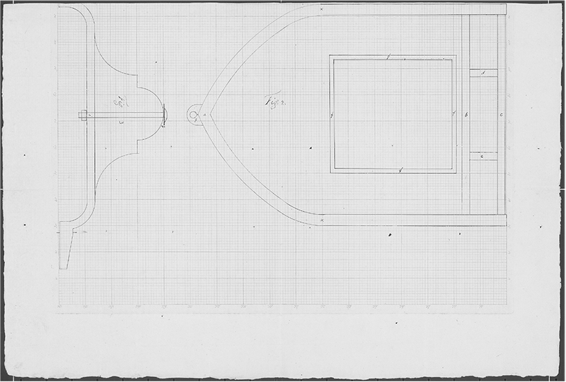 4. is merely to shew the foresprings, & Fig. 5. the hind-springs by which the seat & it’s frame f. is suspended to the main frame in it’s postion1 Fig. 2. the fore springs being in the line of direction of the carriage, & the hind springs at right angles with it. | |